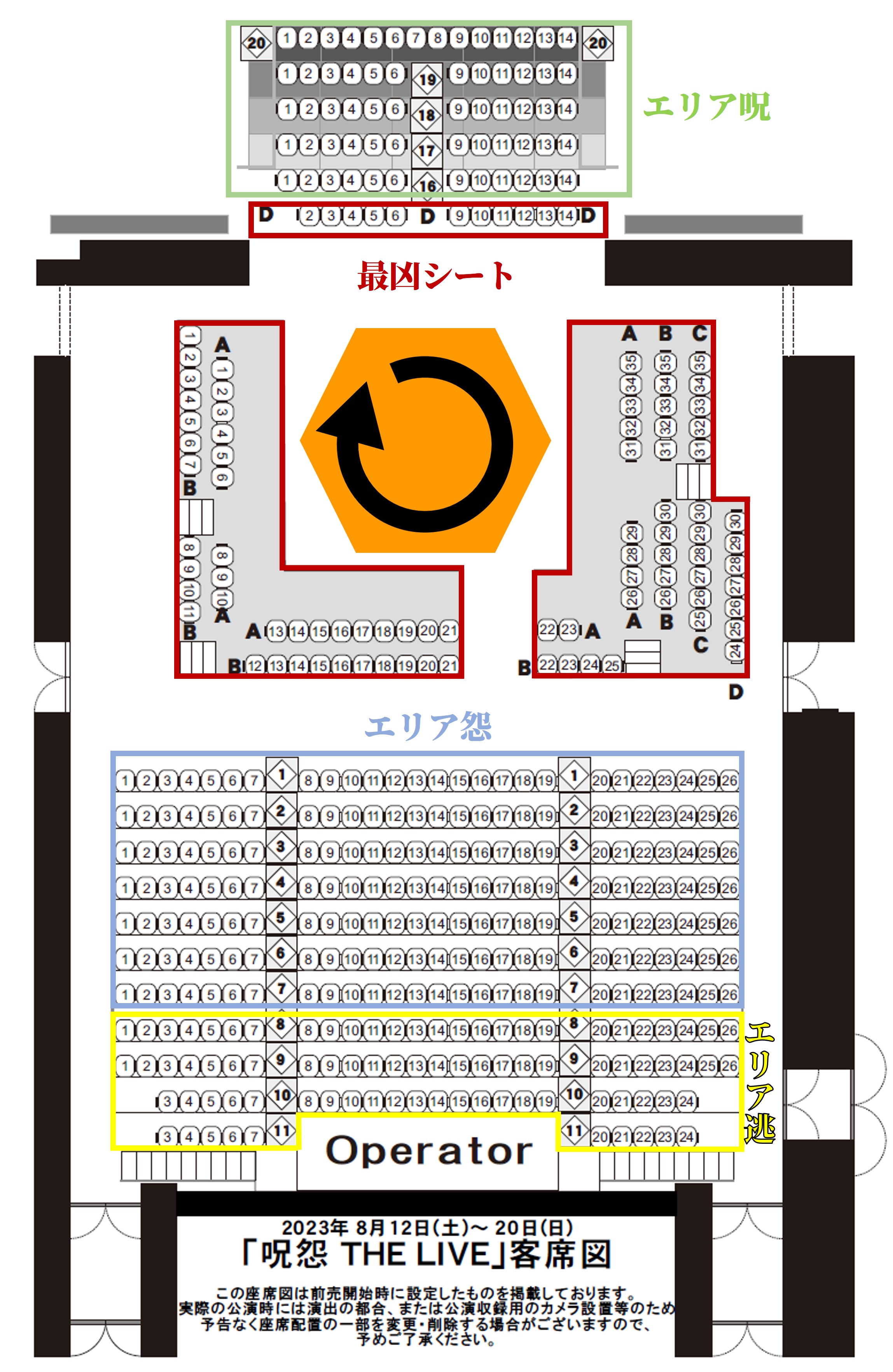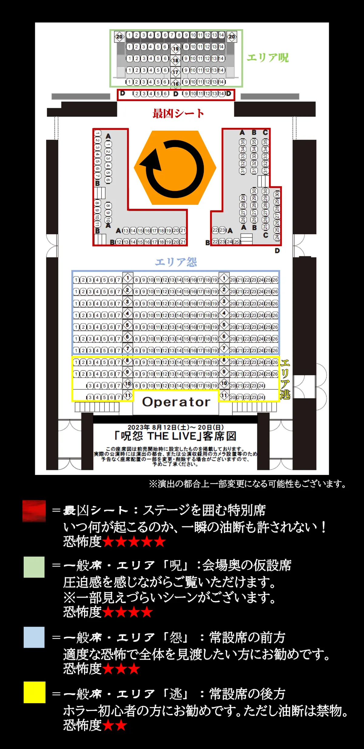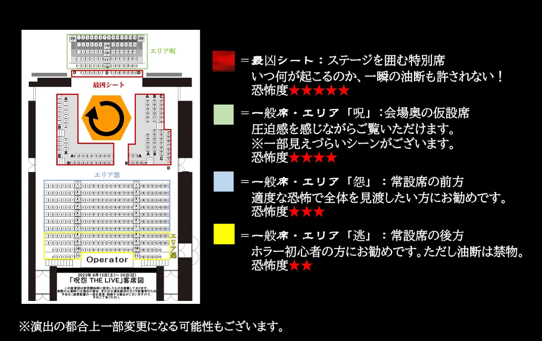 - ◇演出の都合上、開演から一定の時間は客席にはご案内できません。ご案内できる時間になりましたら、係員が誘導いたします。また、最凶シート及び一般席:エリア「怨」のチケットをお持ちのお客様につきまして、開演後はご指定のお席へご案内できない場合がございます。お時間に余裕をもってのご来場にご協力をお願いいたします。なお、また、緊急時を除き、開演中の入退場はご遠慮いただきますようお願いいたします。